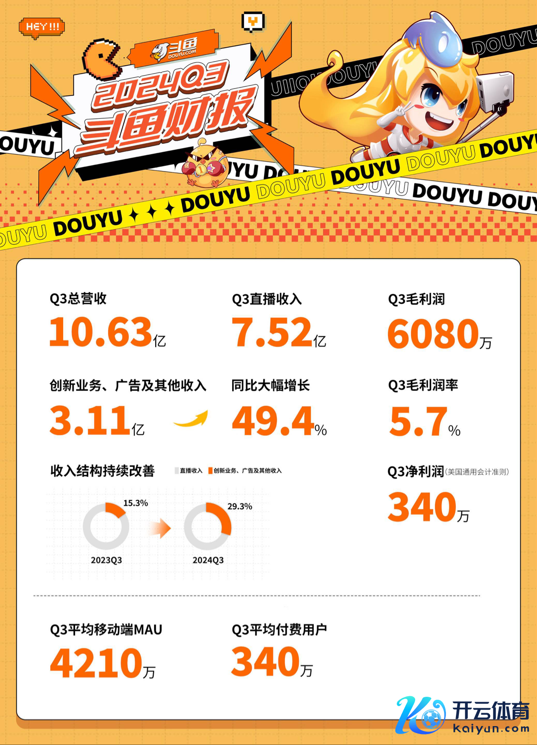 财报涌现,斗鱼转移端季度平均MAU为4210万,季度平均付用度户数为340万。总营收为10.63亿元,8个季度以来初度兑现环比增长。直播收入为7.52亿元,毛利润为6080万元,毛利润率5.7%,净利润为340万元。其中,翻新业务、告白偏激他收入兑现正经增长,达到3.11亿元,大幅增长49.4%,收入孝敬占比29.3%,较23年同时的15.3%有显耀升迁。