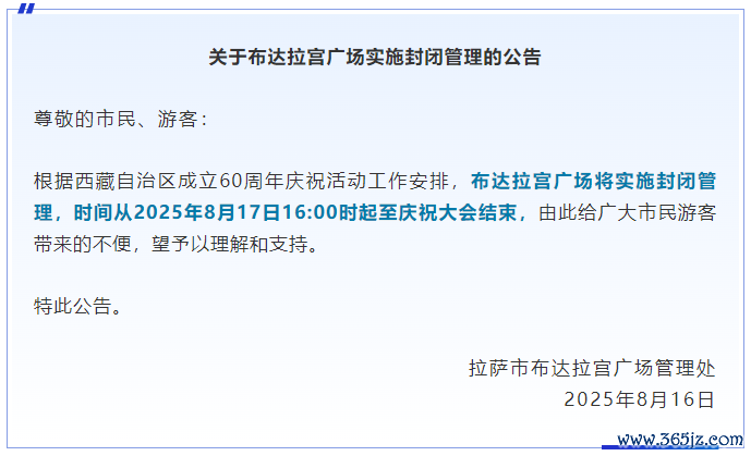 把柄西藏自治区设立60周年庆祝举止使命安排,布达拉宫广场将推行阻滞处置,时辰从2025年8月17日16时起至庆祝大会牺牲,由此给纷乱市民搭客带来的未便,望给予交融和营救。